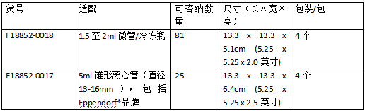 耐低溫的塑料凍存盒有兩個(gè)尺寸:可容納81個(gè)1.5-2ml的微型管/冷凍瓶?jī)龃婧泻涂扇菁{25個(gè)5ml的錐形離心管(包括Eppendorf 品牌)。
